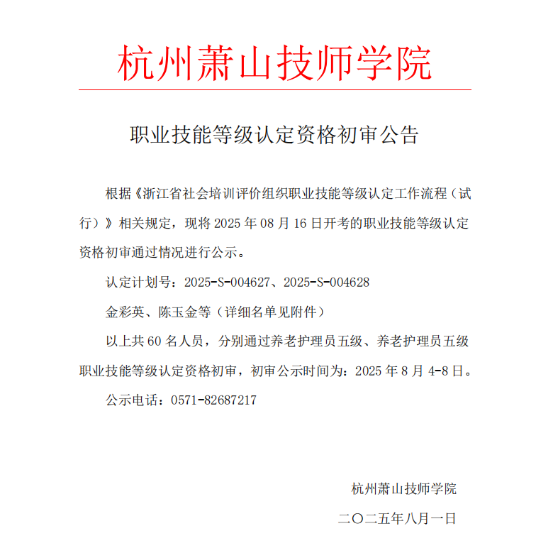 根据《浙江省社会培训评价组织职业技能等级认定工作流程 (试行)》相关规定,现将2025年8月16日开考的职业技能等级认定资格初审通过情况进行公示。 杭州萧山技师学院 二〇二五年八月一日
