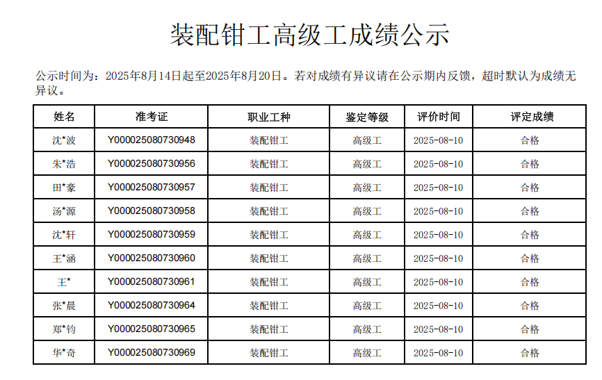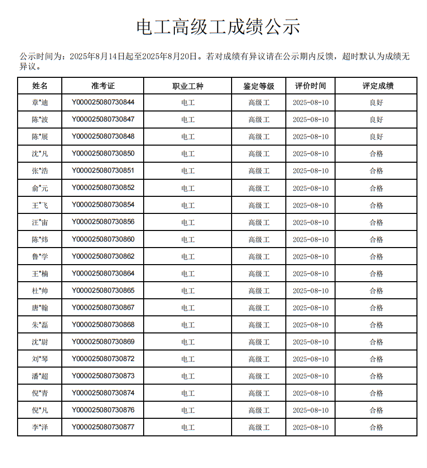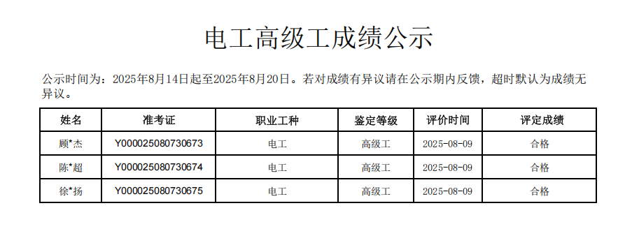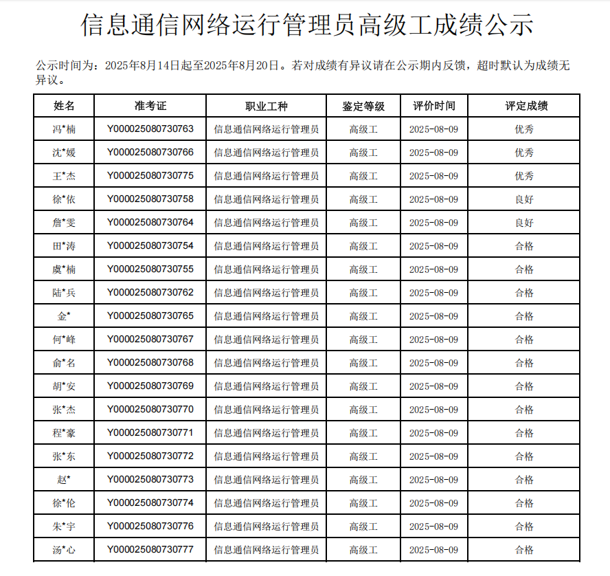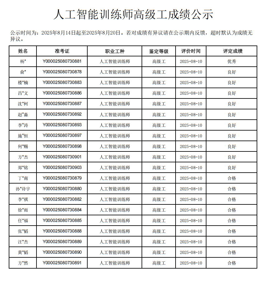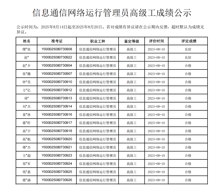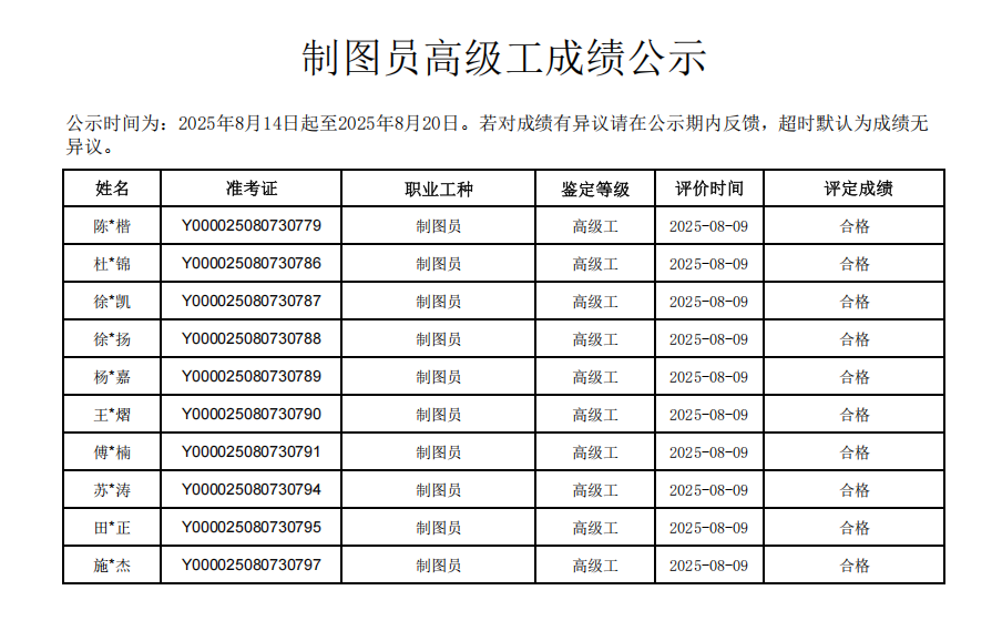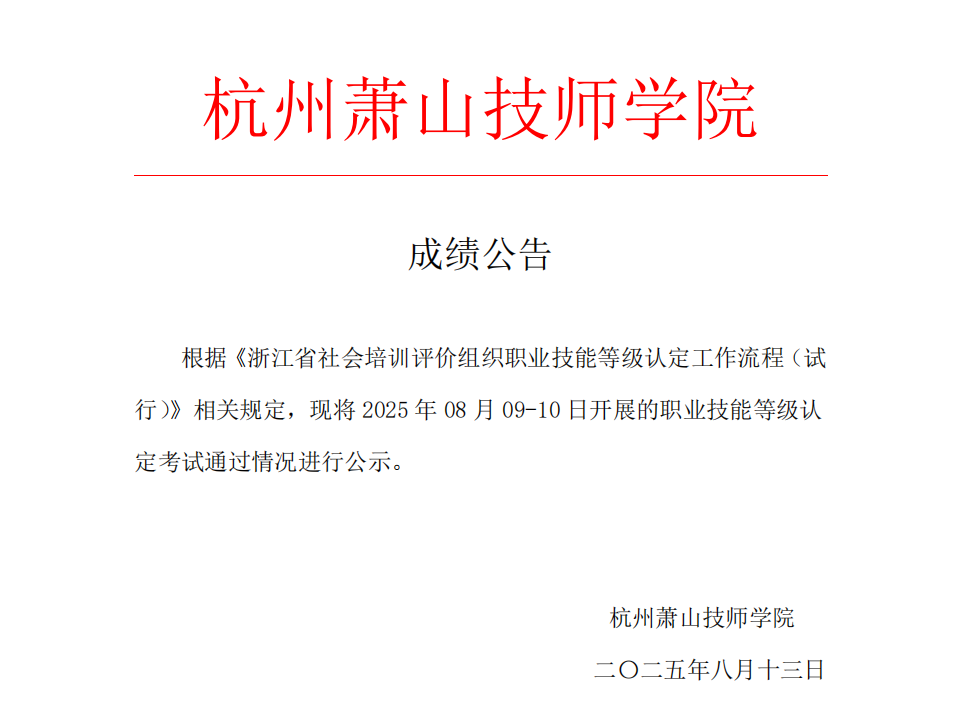 根据《浙江省社会培训评价组织职业技能等级认定工作流程 (试行)》相关规定,现将2025年08月09-10日开展的职业技能等级认定考试通过情况进行公告。