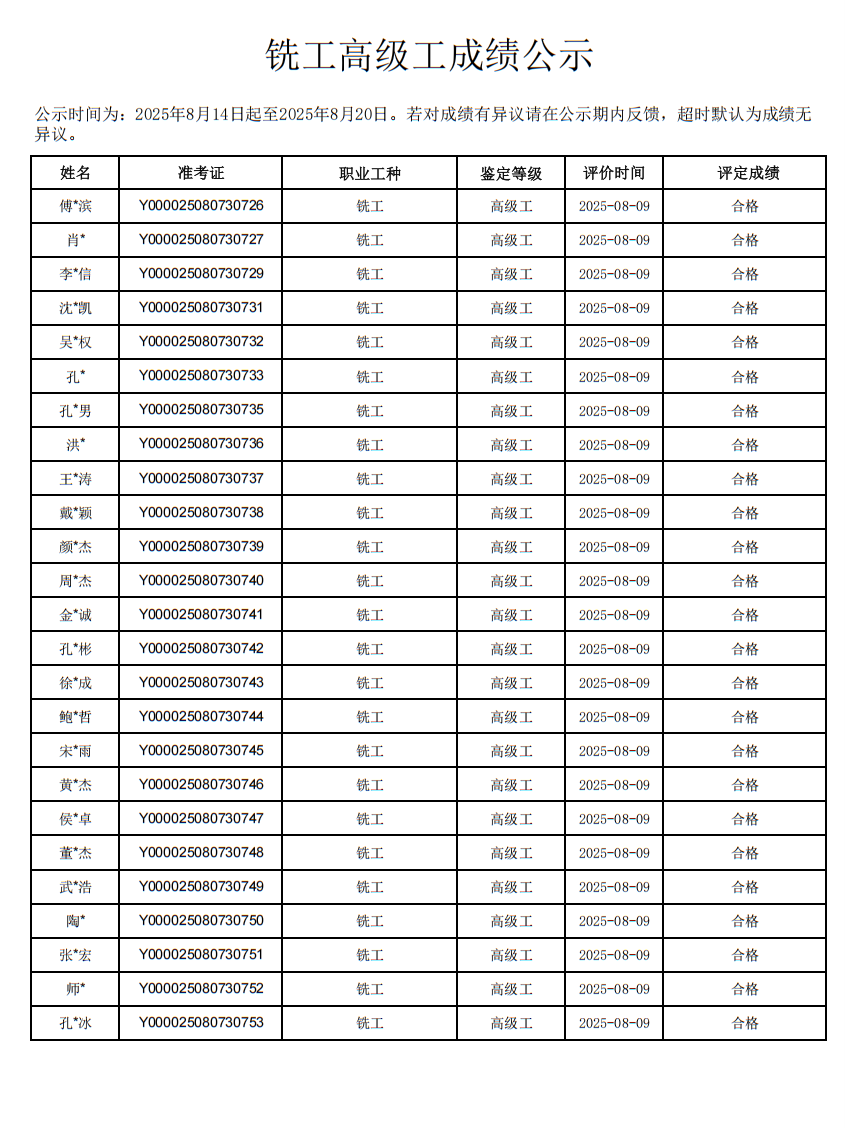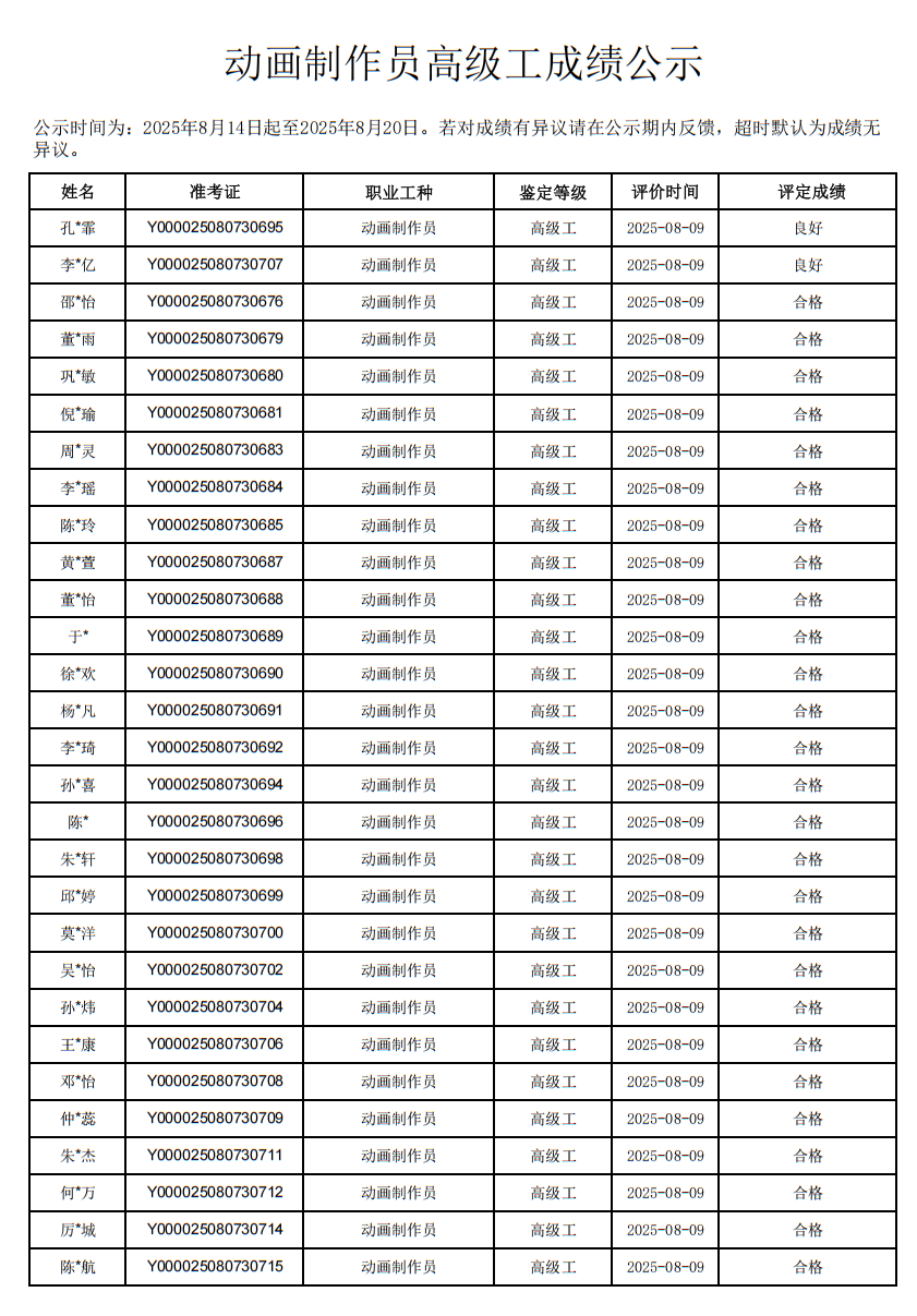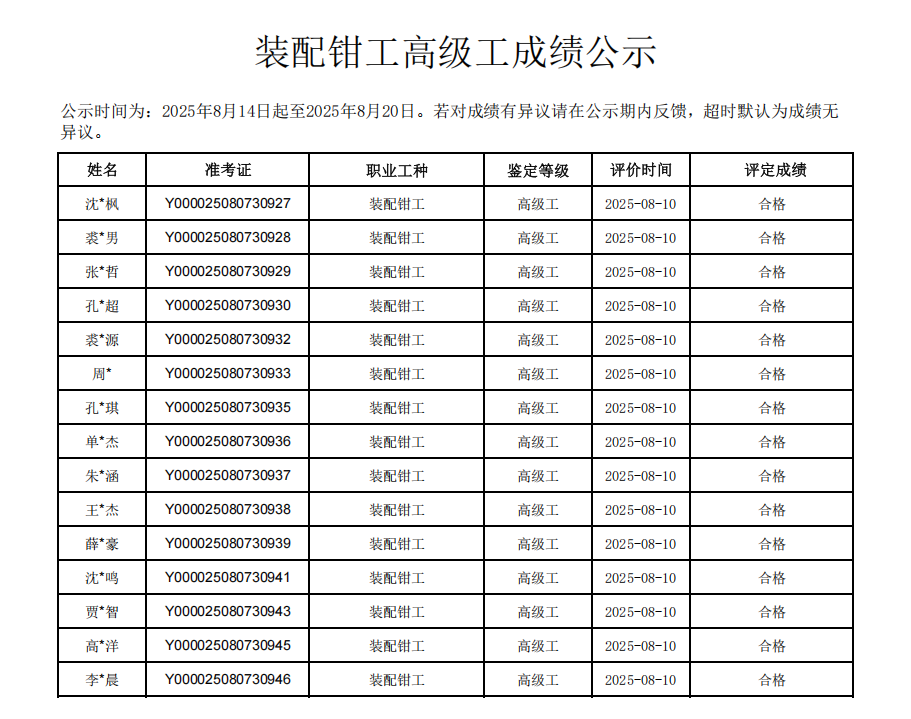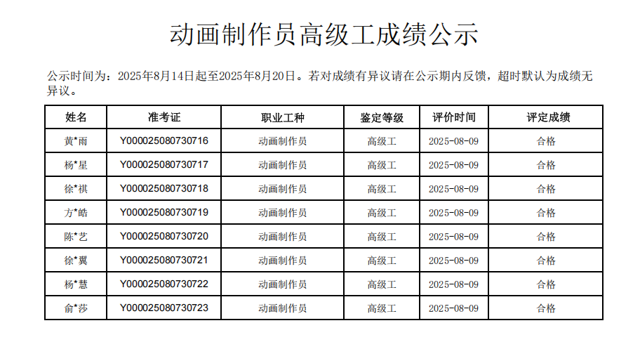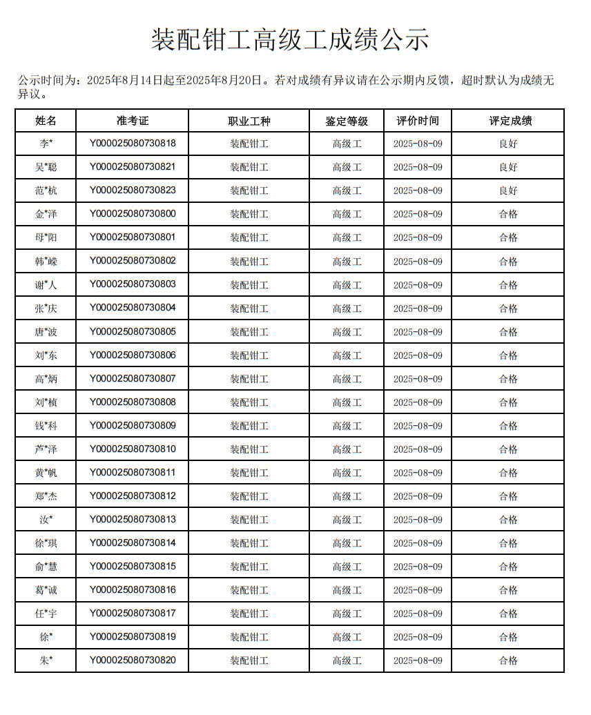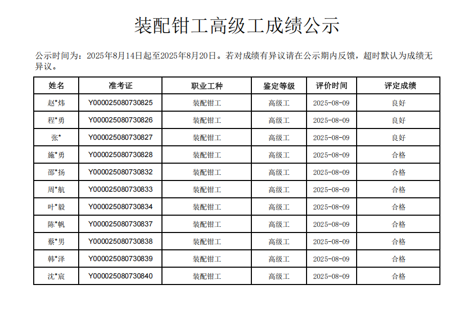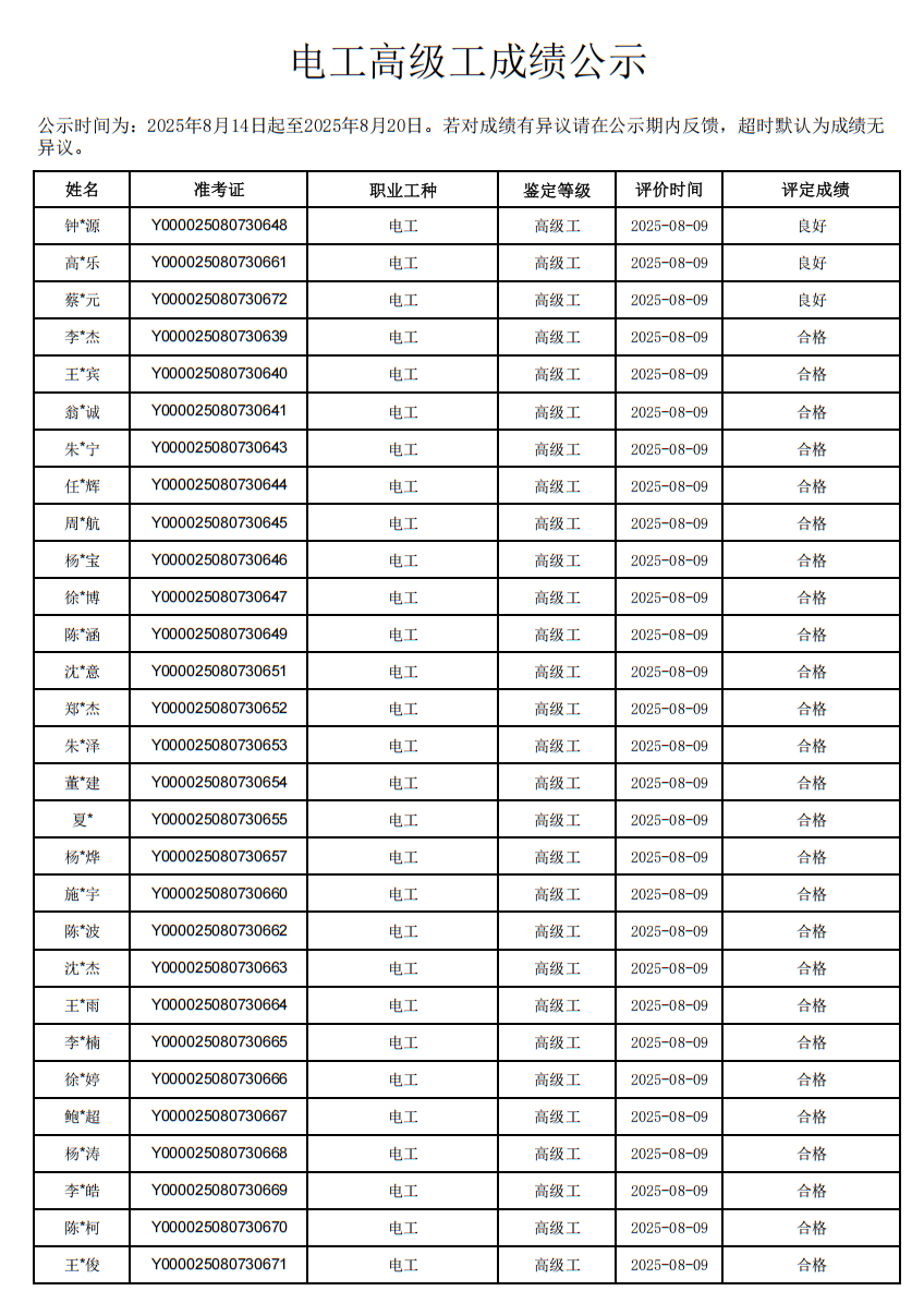 根据《浙江省社会培训评价组织职业技能等级认定工作流程 (试行)》相关规定,现将2025年08月09-10日开展的职业技能等级认定考试通过情况进行公告。