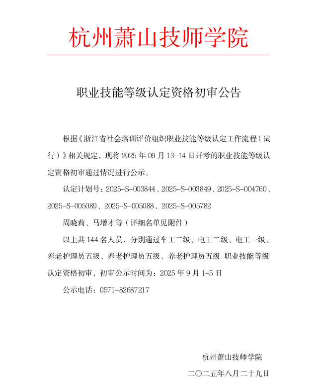 根据《浙江省社会培训评价组织职业技能等级认定工作流程 (试行)》相关规定,现将2025年9月13-14日开考的职业技能等级认定资格初审通过情况进行公示。