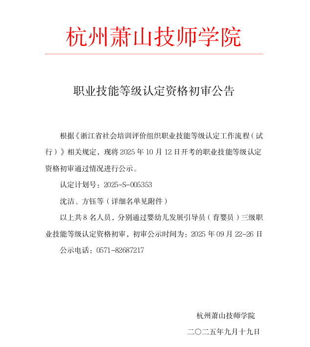 根据《浙江省社会培训评价组织职业技能等级认定工作流程 (试行)》相关规定,现将2025年10月12日开考的职业技能等级认定资格初审通过情况进行公示。