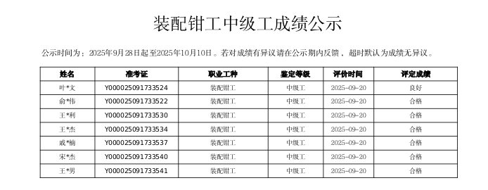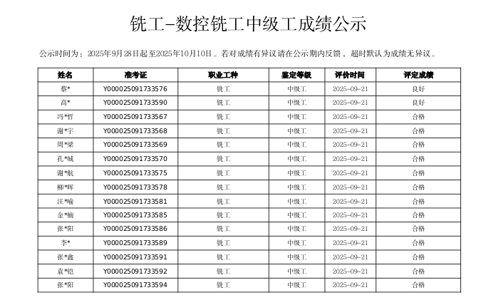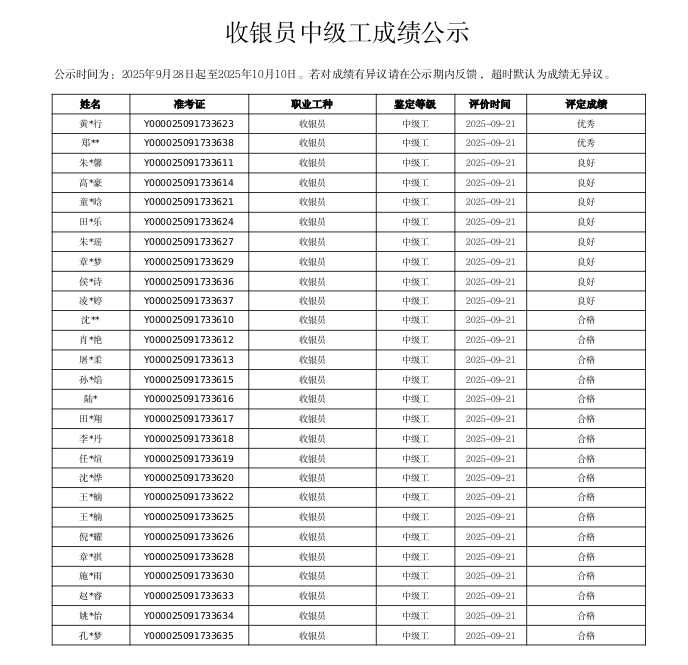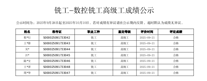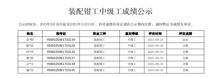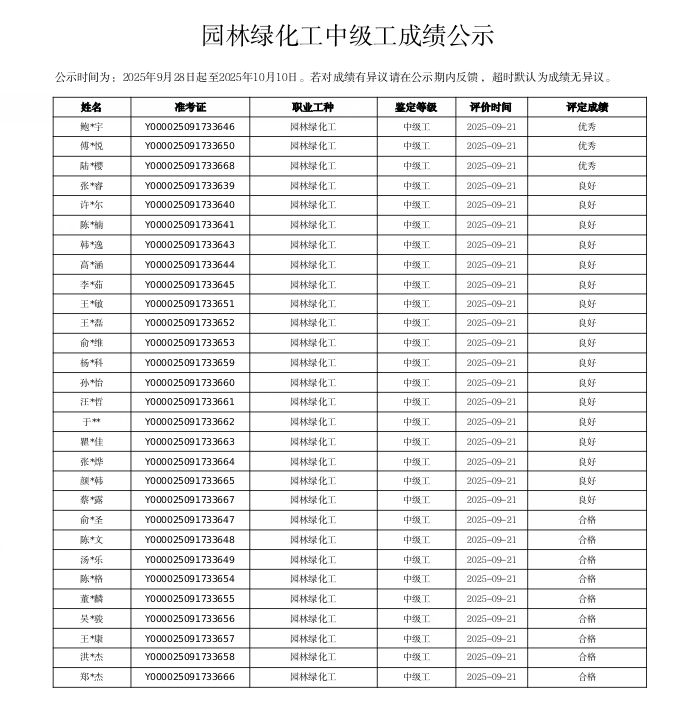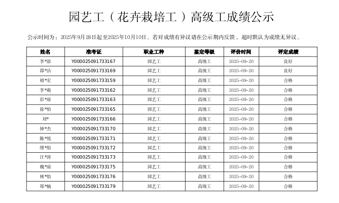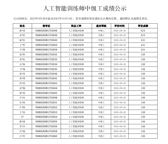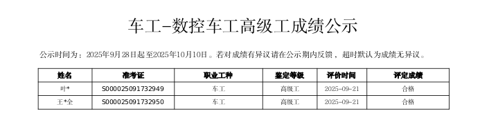 根据《浙江省社会培训评价组织职业技能等级认定工作流程 (试行)》相关规定,现将2025年9月20-21日开展的职业技能等级认定考试通过情况进行公告。