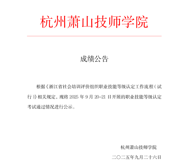 下一篇:2025年9月27日杭州萧山技师学院职业技能等级认定考试成绩公告