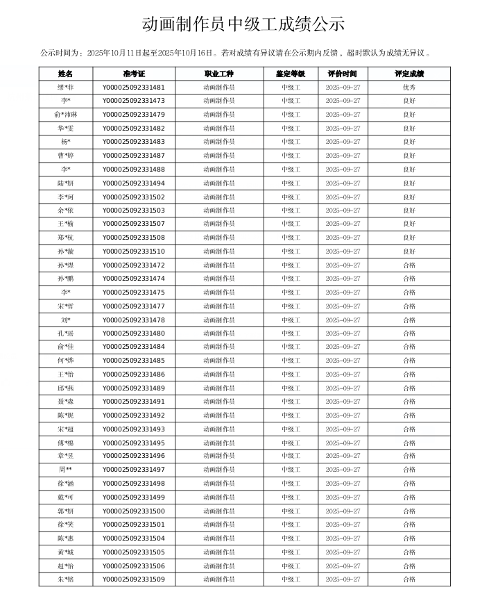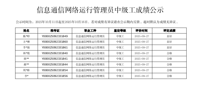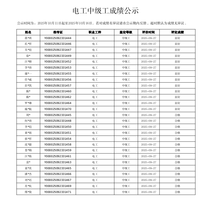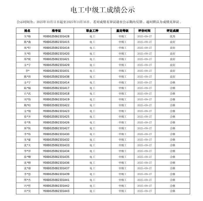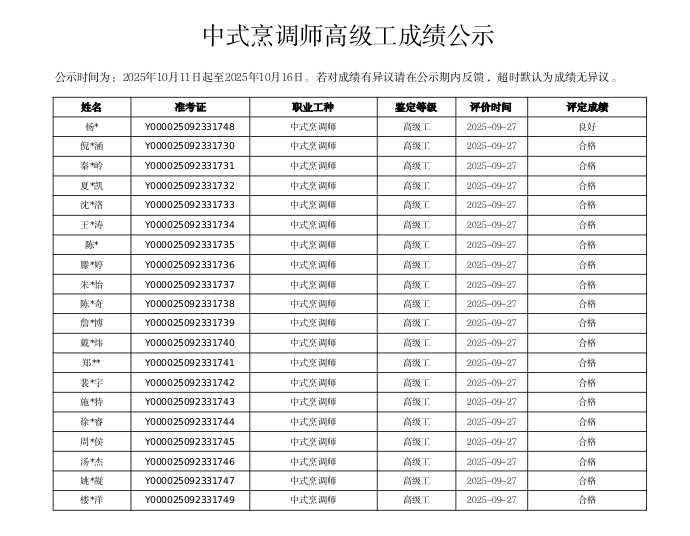 根据《浙江省社会培训评价组织职业技能等级认定工作流程 (试行)》相关规定,现将2025年9月27日开展的职业技能等级认定考试通过情况进行公告。