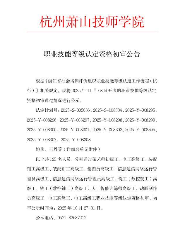 根据《浙江省社会培训评价组织职业技能等级认定工作流程 (试行)》相关规定,现将2025年11月8日开考的职业技能等级认定资格初审通过情况进行公示。