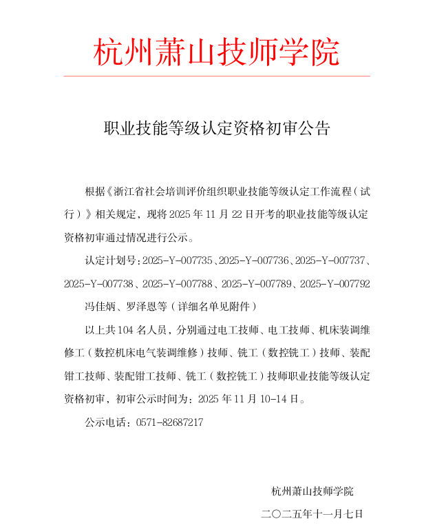 根据《浙江省社会培训评价组织职业技能等级认定工作流程 (试行)》相关规定,现将2025年11月22日开考的职业技能等级认定资格初审通过情况进行公示。