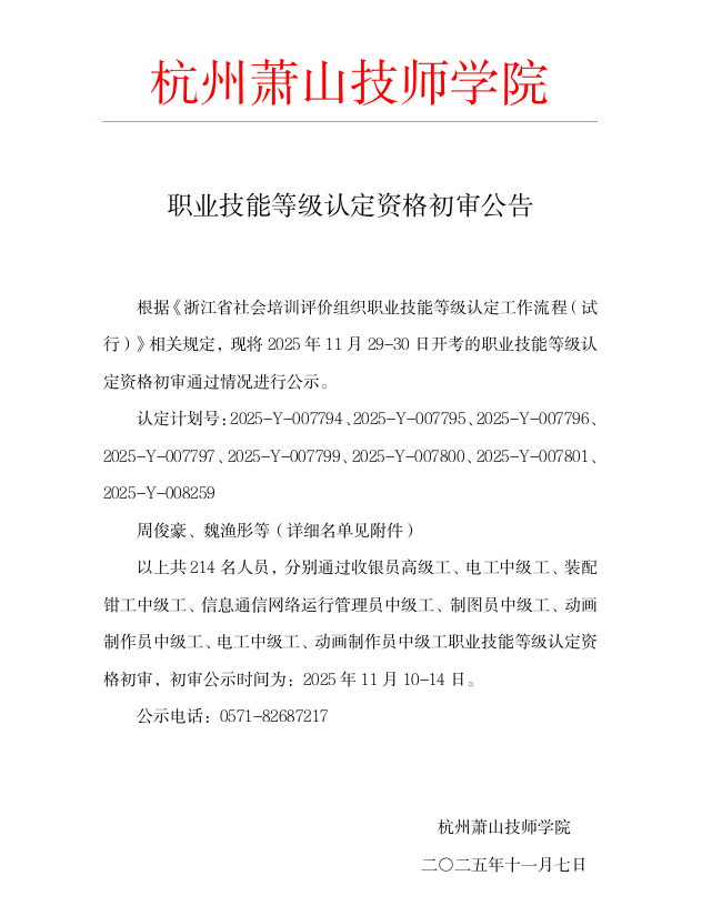 根据《浙江省社会培训评价组织职业技能等级认定工作流程 (试行)》相关规定,现将2025年11月29-30日开考的职业技能等级认定资格初审通过情况进行公示。