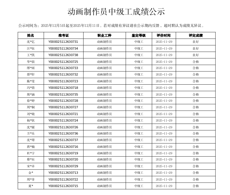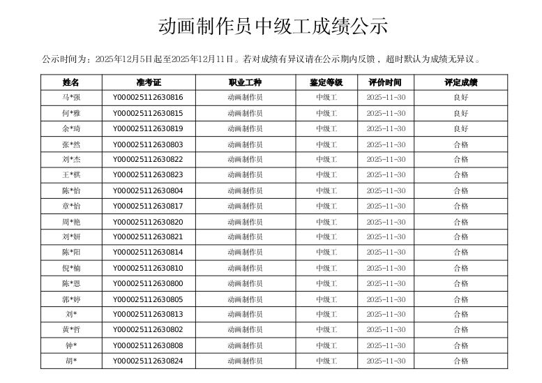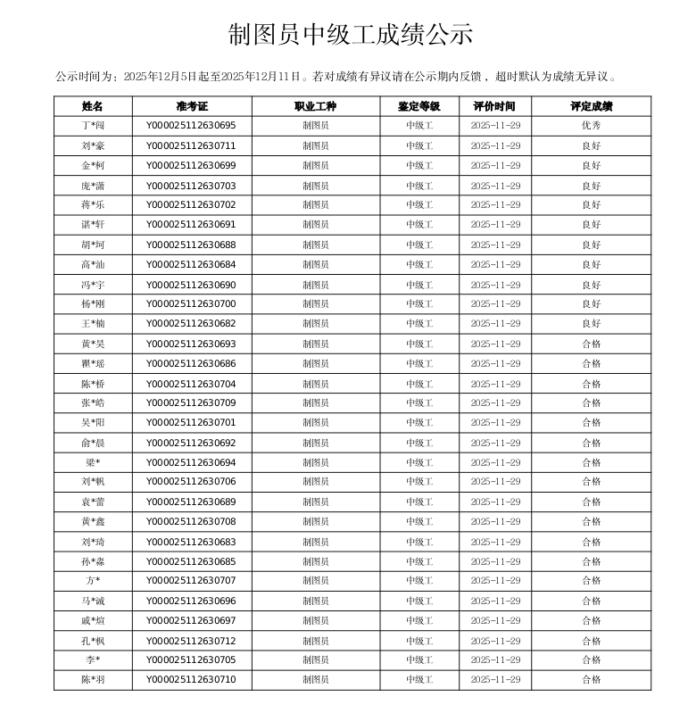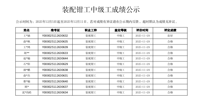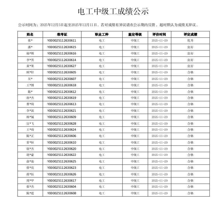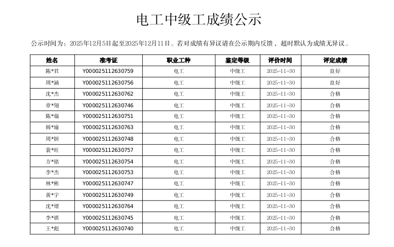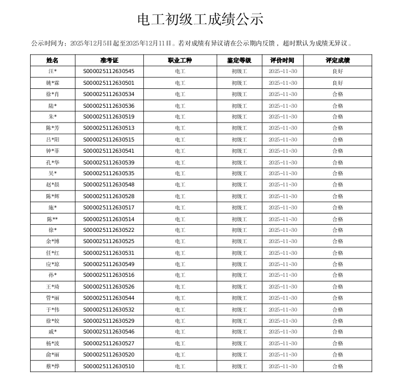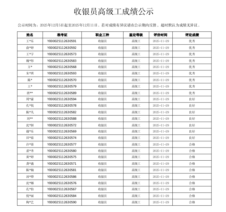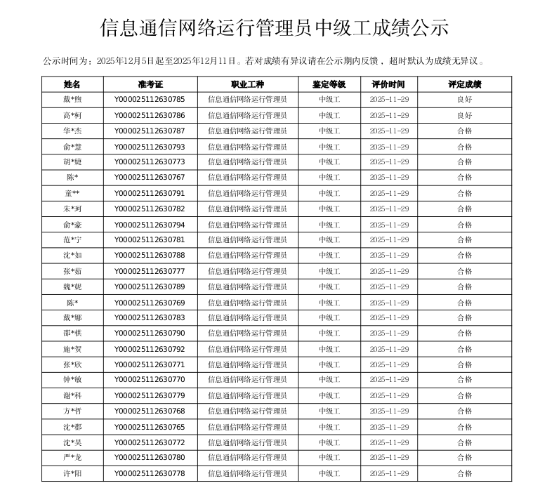 根据《浙江省社会培训评价组织职业技能等级认定工作流程 (试行)》相关规定,现将2025年11月29-30日开展的职业技能等级认定考试通过情况进行公告。