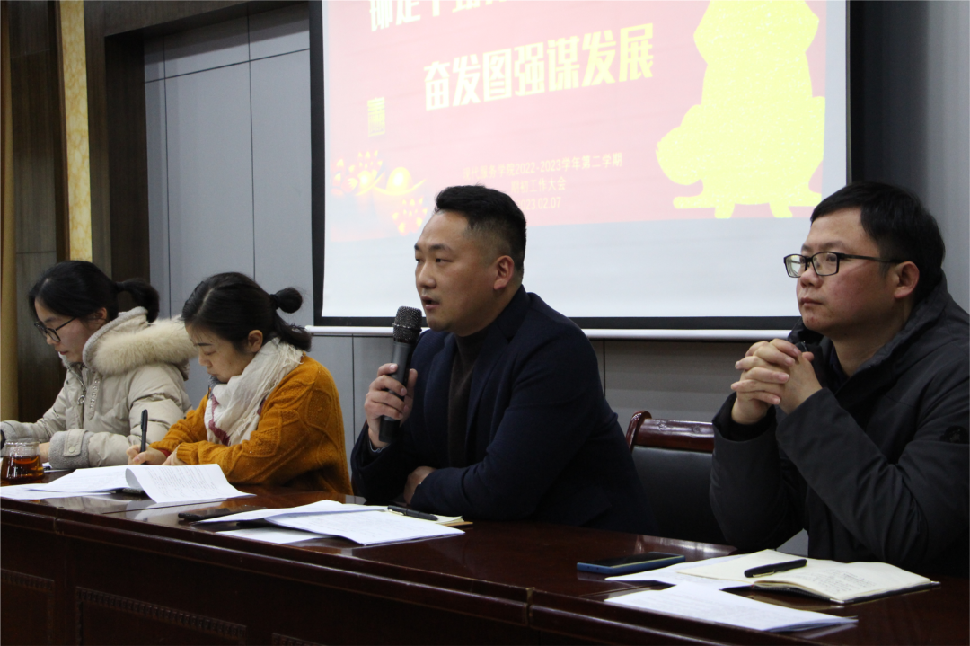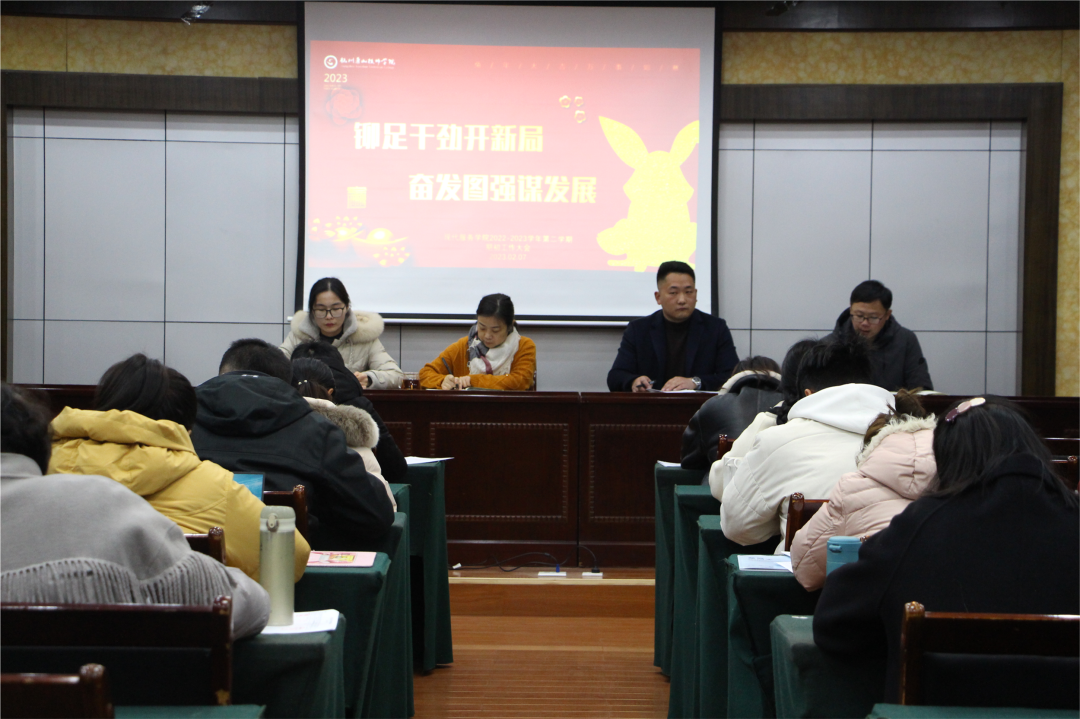 律回春晖渐,万象始更新。2月7日下午,现代服务学院召开以“铆足干劲开新局,奋发图强谋发展”为主题的2022-2023学年第二学期期初工作会议。副校长何颖丽、现代服务学院名誉院长孙玮琳、副院长陈聪玮、杨建生,院长助理施春燕出席会议,分院全体教职工参加会议。会议由副院长陈聪玮主持。
