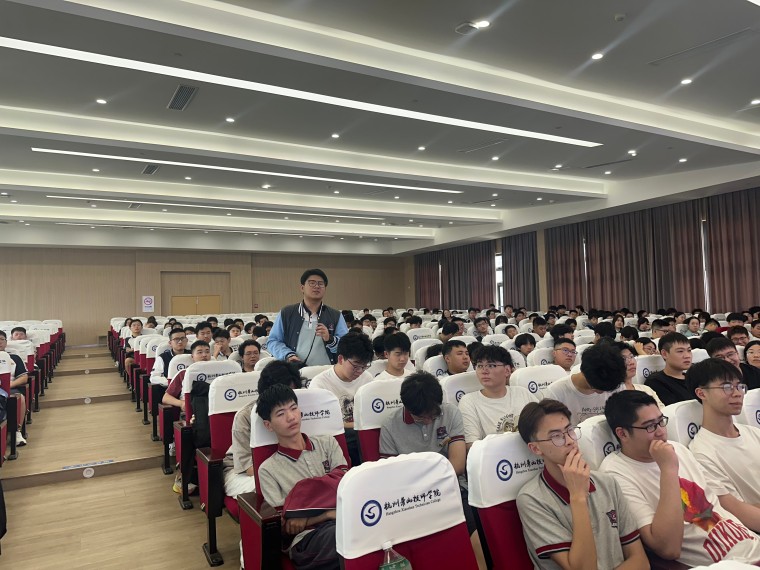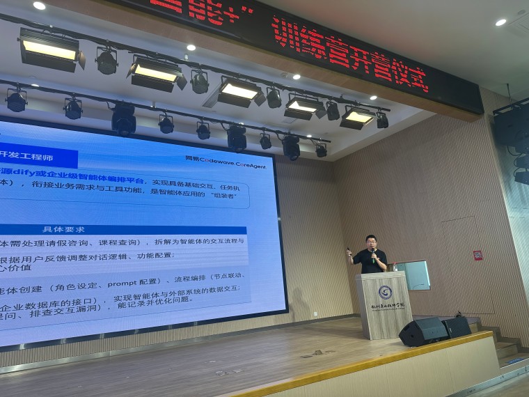 随后,网易公司老师开展专题讲座,带来行业前沿动态与专业知识,为同学们后续学习筑牢基础。集训营课程体系丰富实用,涵盖始业教育、认证案例培训、选拔考试、进阶知识学习、场景题训练、智能体开发及项目实战等环节。学生将在企业化学习场景中锤炼技能、积累经验,表现优异者还能获得网易实习、转正机会。仪式现场特设互动提问环节,学子们踊跃举手,围绕课程学习重点、职业发展方向等问题积极提问,网易技术导师结合行业经验与集训安排,逐一细致解答,现场氛围热烈。活动后期,陈天昊老师进行了企业经验分享。