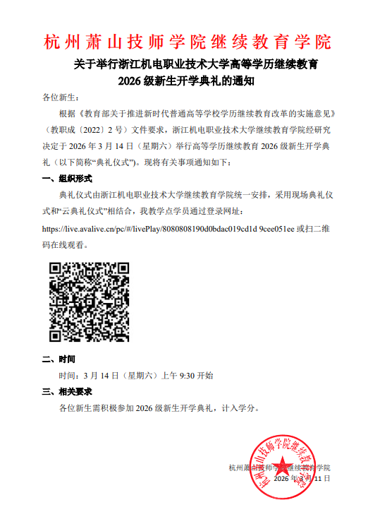 浙江机电职业技术大学继续教育学院2026级新生开学典礼的通知