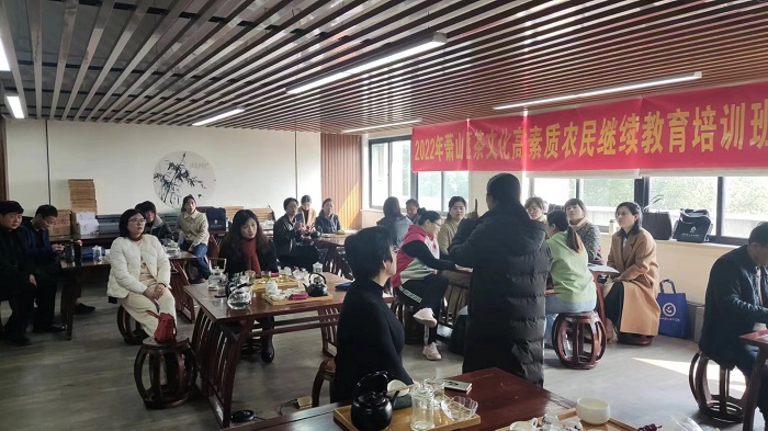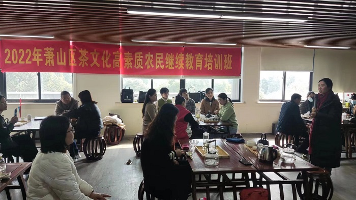 为更好的普及和传播我区茶文化,以茶叶产业带动共同富裕,培养优秀茶产业技能人才,助推我区茶产业高质量发展。根据2022年高素质农民培育计划要求,对2022年萧山区茶文化高素质农民培训人员进行跟踪继续教育服务及中级茶艺师技能考试,我院举办了2022年茶文化高素质农民继续教育培训班。2022年培育的茶文化高素质农民大约40人参加了此次培训和考试。